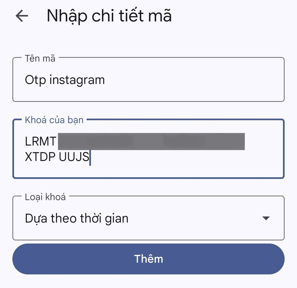 Sau khi cài đặt và kích hoạt ứng dụng Google Authenticator, bạn nhấn vào biểu tượng dấu “+” trên giao diện chính của ứng dụng này, chọn “Nhập khóa thiết lập”. Tại mục tên mã, bạn có thể đặt tên bất kỳ (chẳng hạn OTP Instagram), sau đó copy đoạn mã khóa trên ứng dụng Instagram, dán vào khung “Khóa của bạn” và nhấn nút “Thêm”.