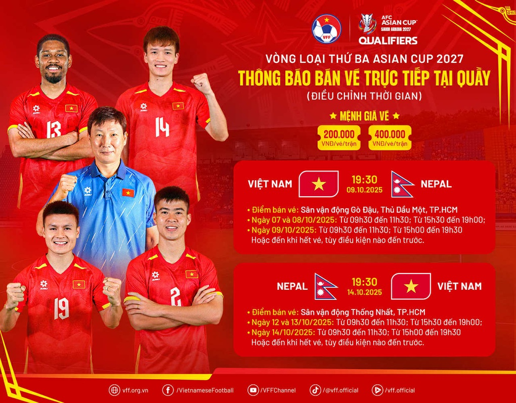 Theo kế hoạch, trong ngày 4/10, đội tuyển Việt Nam sẽ chính thức hội quân tại TPHCM. Thầy trò HLV Kim Sang Sik có quỹ thời gian 5 ngày tập luyện trước khi bước vào trận lượt đi gặp Nepal lúc 19h30 ngày 9/10 trên sân vận động Gò Đậu (Thủ Dầu Một, TPHCM). Trận lượt về diễn ra lúc 19h30 ngày 14/10 trên sân vận động Thống Nhất (TPHCM).