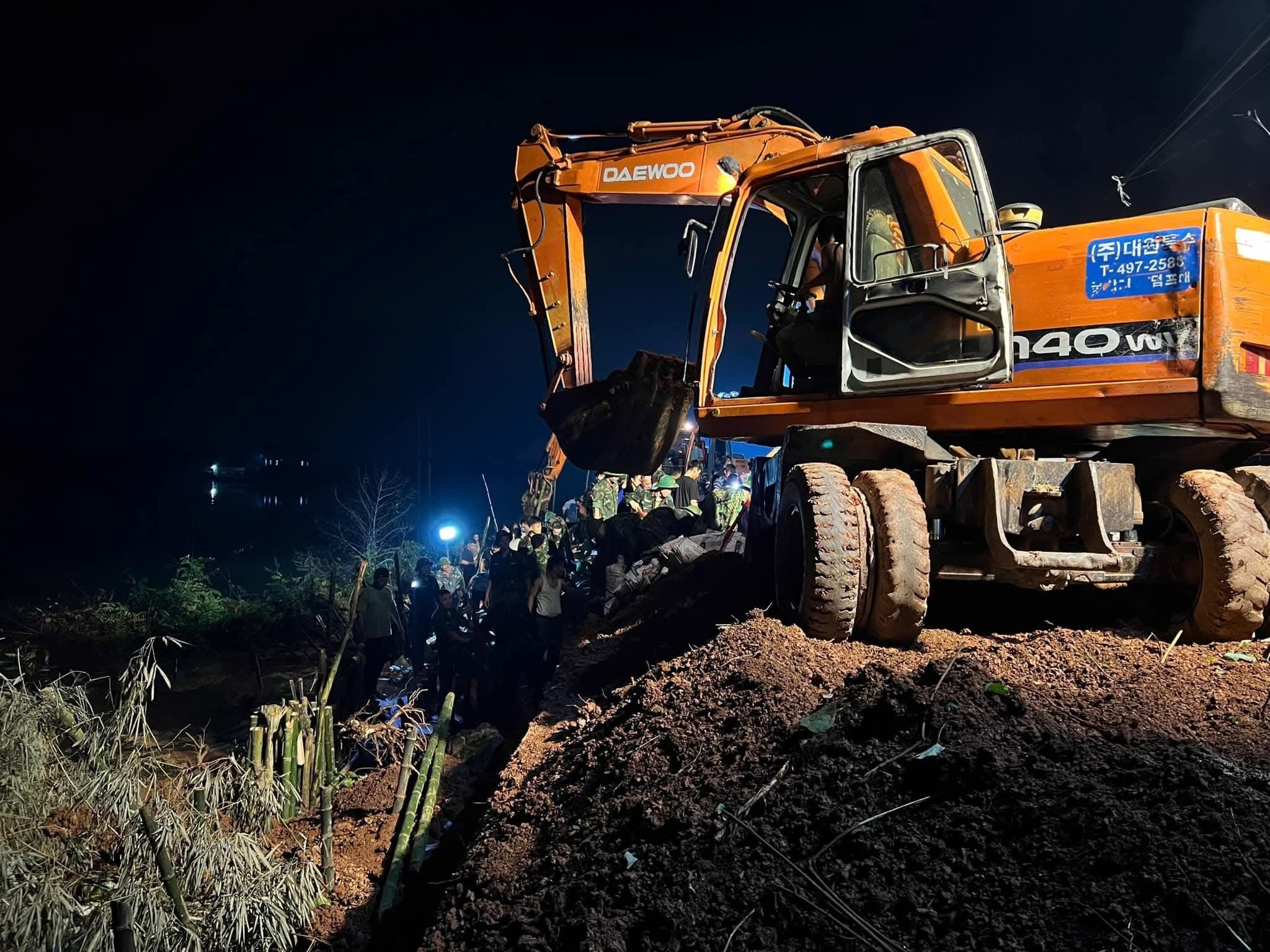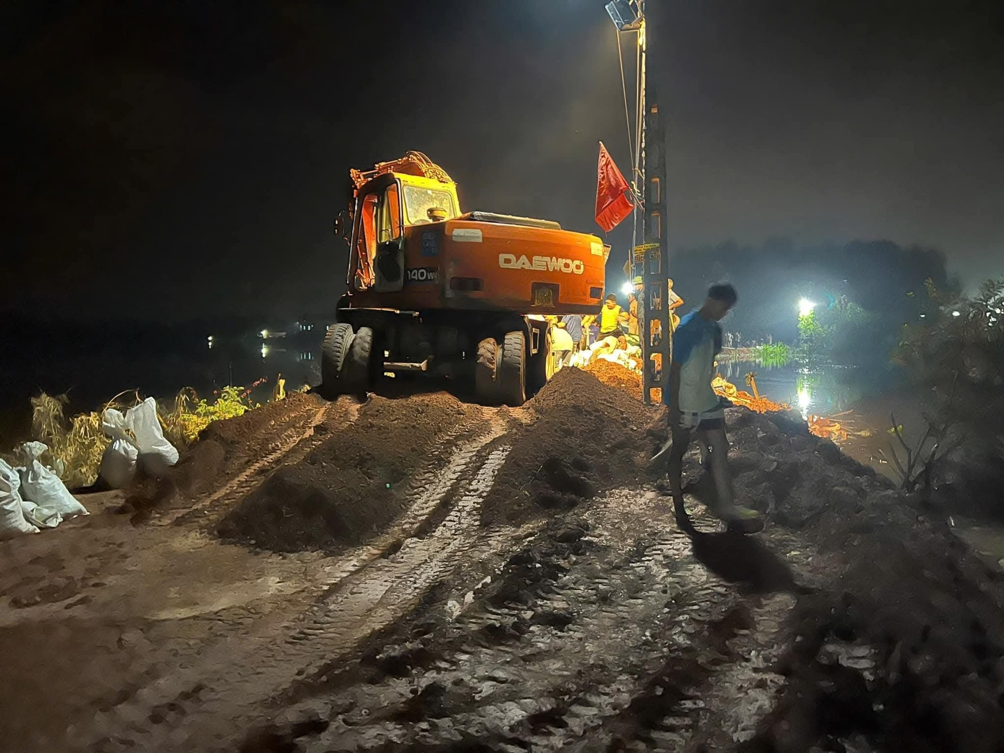 Giữa đêm khuya, người dân các thôn của xã Mỹ Thái cùng lực lượng hỗ trợ vẫn đang nỗ lực gia cố, quyết tâm giữ đê