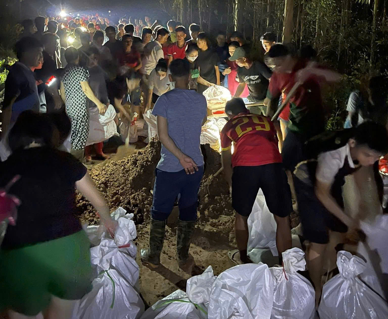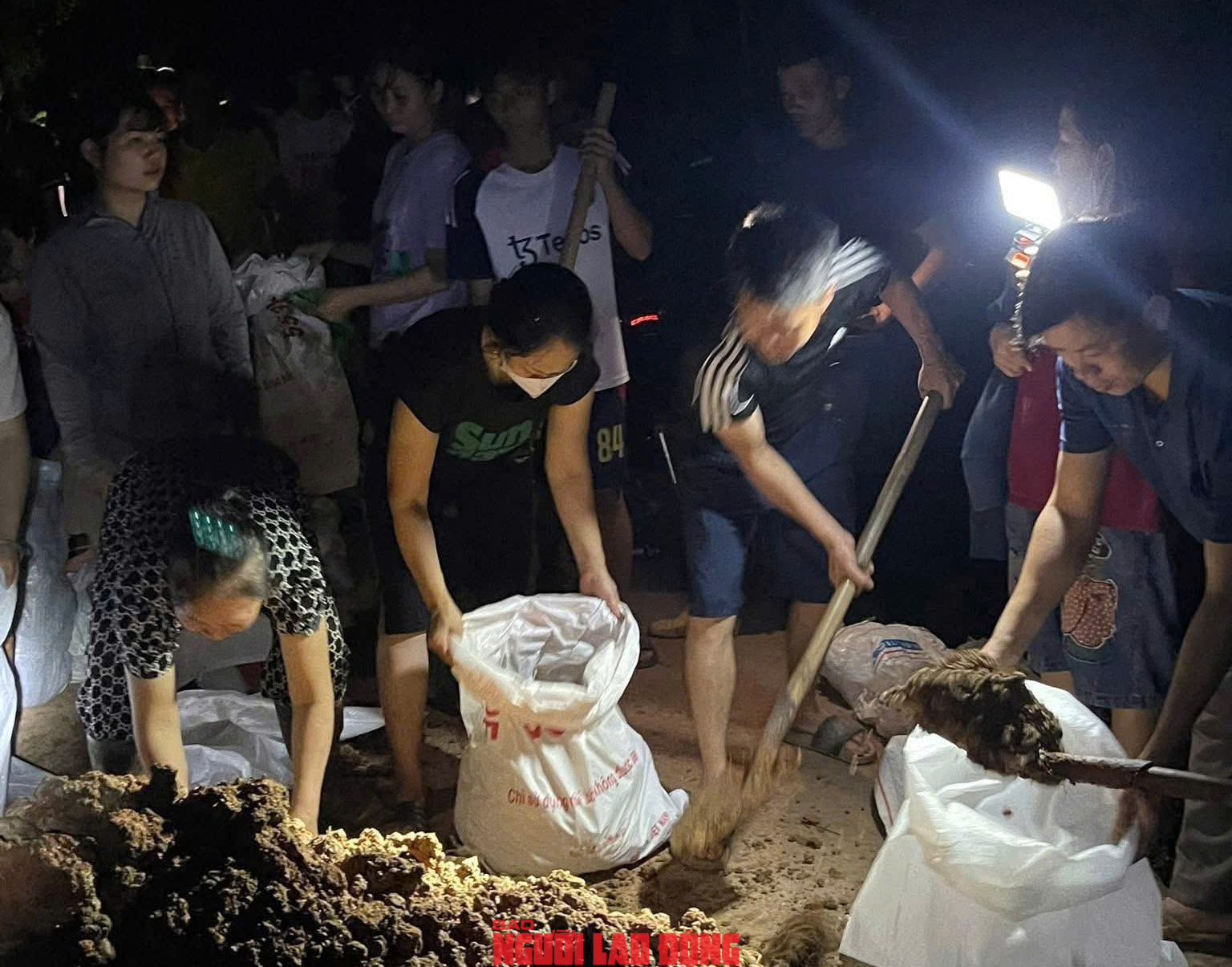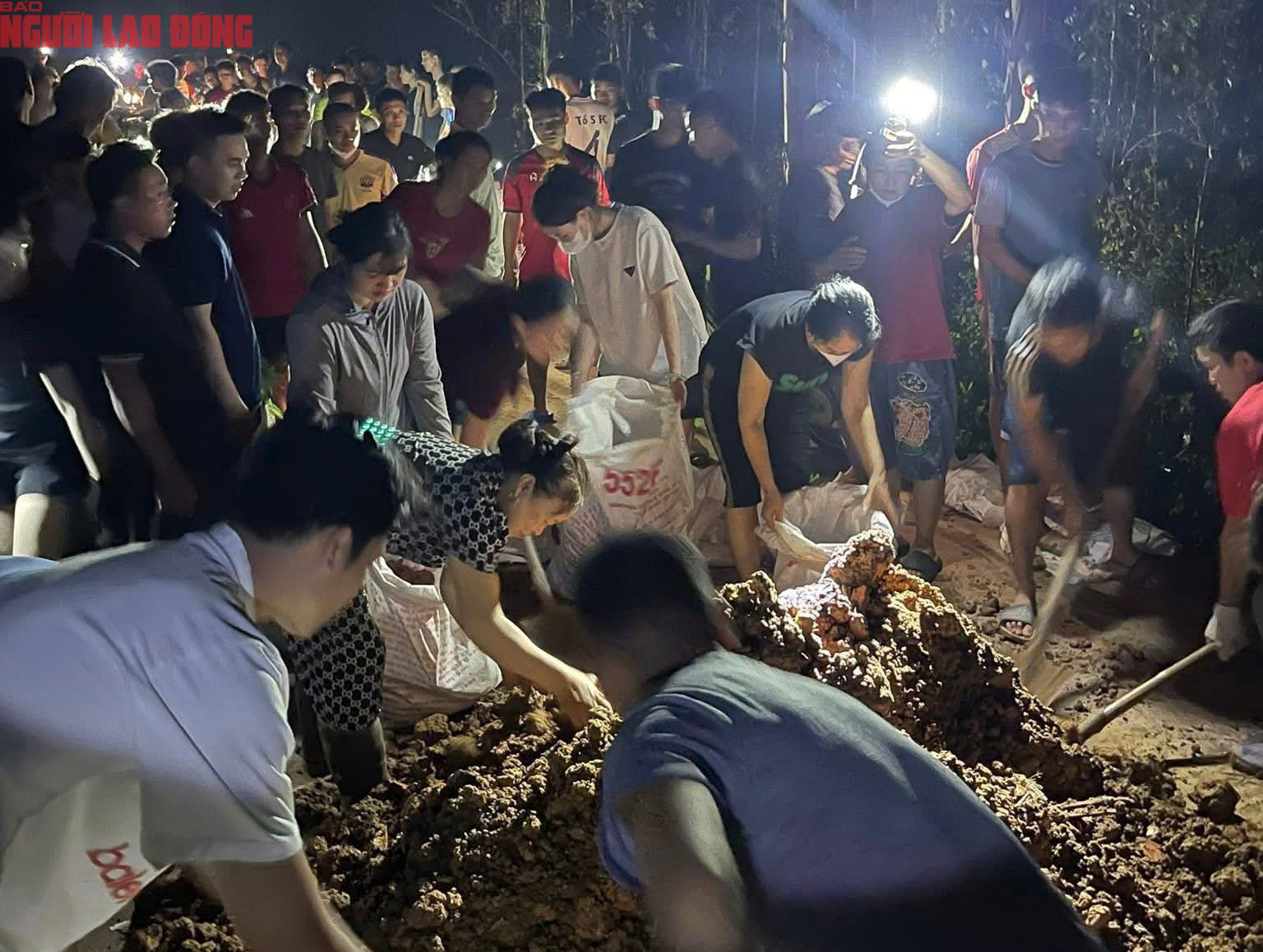 Giữa đêm khuya, người dân các thôn của xã Mỹ Thái cùng lực lượng hỗ trợ vẫn đang nỗ lực gia cố, quyết tâm giữ đê. Ảnh: Hoàng Thành