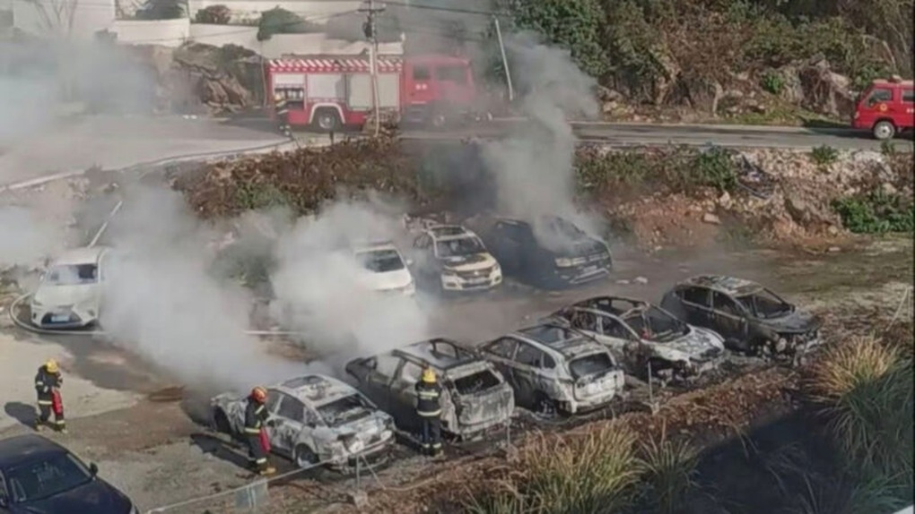 Chiếc Avatr 06 bốc cháy dữ dội, lửa lan sang 7 xe khác xung quanh (Ảnh: The Sanxiang Daily).