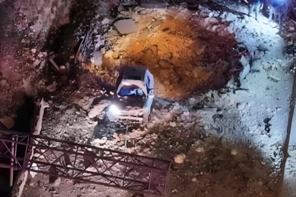 Chiếc BYD Atto 3 nằm bên rìa một hố nổ lớn (Ảnh: Zaker).