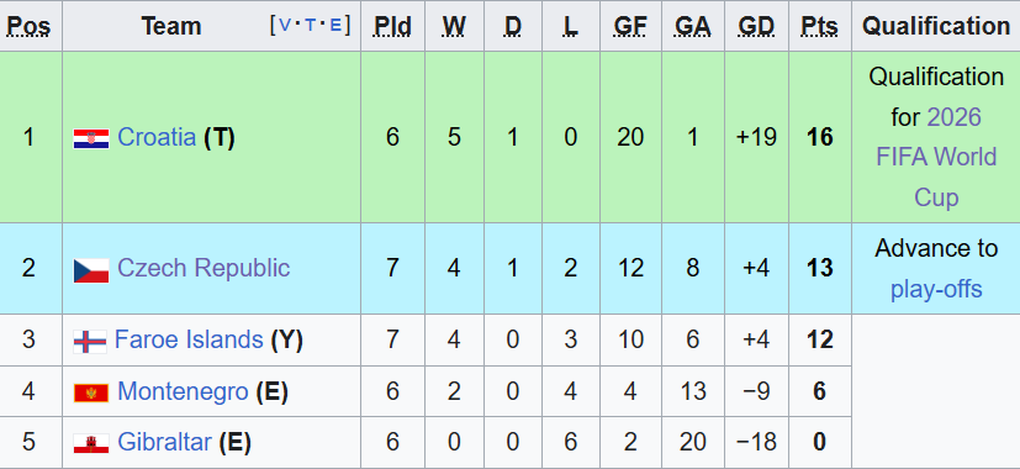 Giờ đây, Quần đảo Faroe đang đứng trước cơ hội không nhỏ giành vé tham dự World Cup 2026. Họ đang xếp thứ 3 bảng L với 12 điểm, kém đội đầu bảng Croatia 4 điểm và ít hơn CH Séc 1 điểm. Ở vòng loại World Cup 2926, Quần đảo Faroe còn một trận đấu nữa gặp Croatia. Đặt giả sử nếu tiếp tục gây bất ngờ trước Croatia, họ hoàn toàn có thể mơ về tấm vé tham dự vòng play-off ở châu Âu.